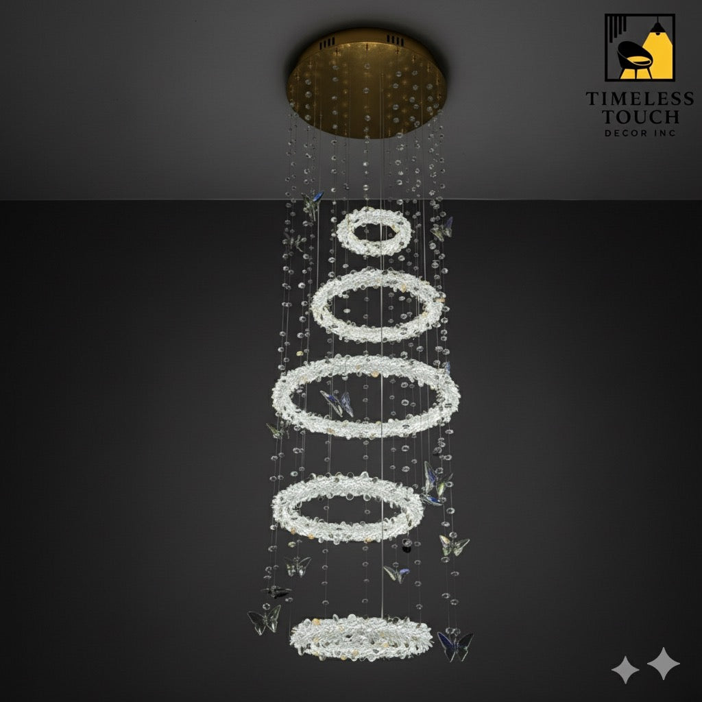 Crystal Butterfly Chandelier. This unique fixture combines modern oval ring elements with cascading crystal butterflies, creating a dynamic and magical light display.