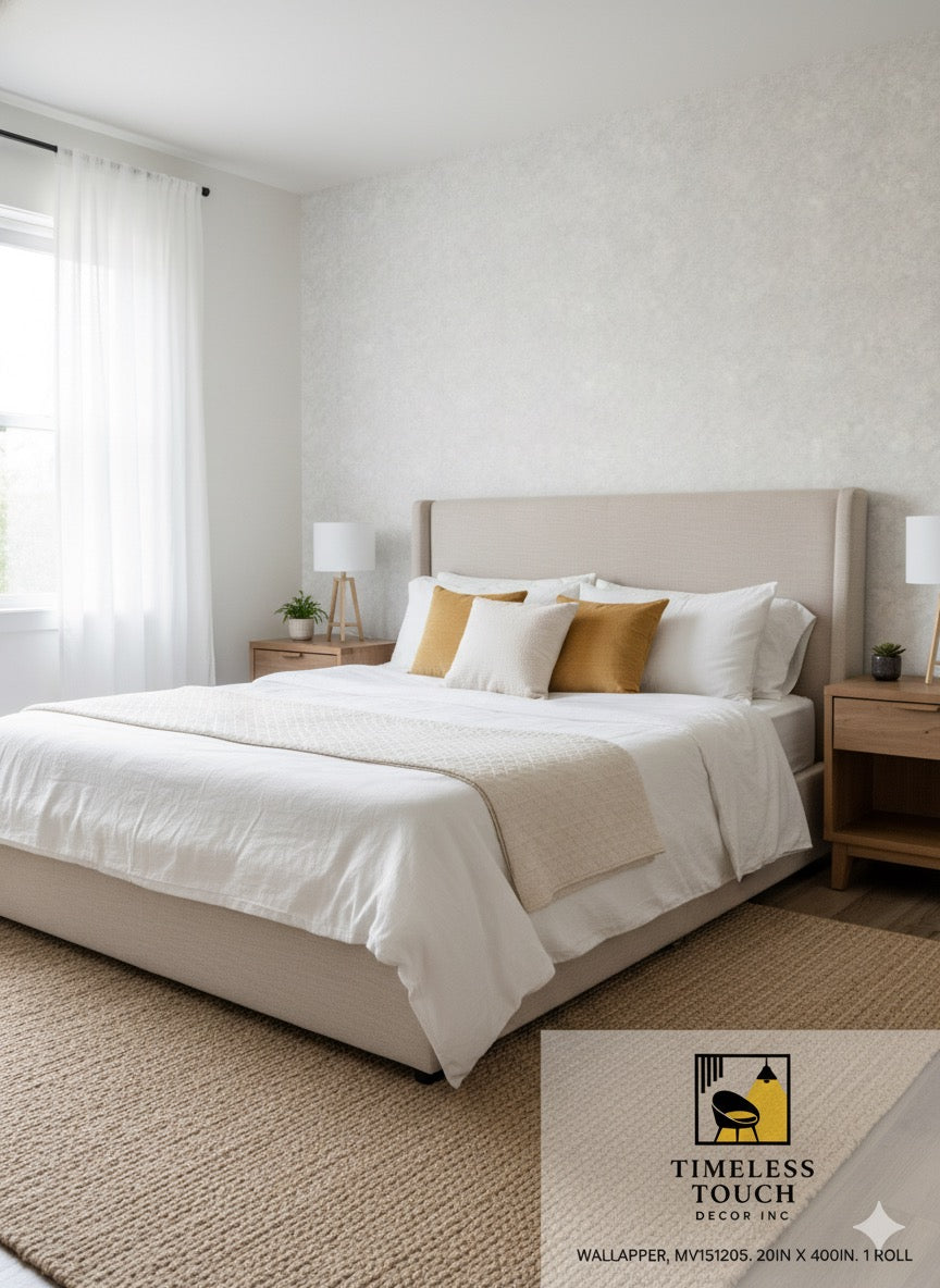 Wallpaper. The subtle, non-repeating pattern provides a soft, organic texture that mimics natural plaster or speckled stone, creating a grounded and inviting atmosphere.
